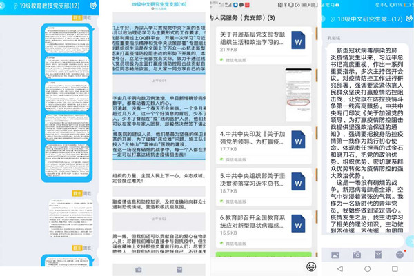 17级教育研究生党支部组织开展了以“众志成城抗击疫情、共克时艰党员先行”为主题的学习贯彻习近平总书记关于疫情防控重要指示批示和讲话精神的线上交流会。17级中文研究生党支部响应号召,认真学习相关文件,针对本次疫情和学习内容发表短评,切实增强自身使命感和责任感。18级教育研究生党支部根据学生党员的实际情况,确定支部学习的重点,并依托微信群开展“线上”组织生活,党支部成员进行了系统地学习与研读。18级中文研究生党支部成员认真学习相关精神重要指示,自觉观看新闻、相关防疫先进事迹报道,结合自己抗疫经验和青年党员身份,在支部群里进行讨论交流。19级教育研究生党支部通过收集防疫期间的“最走心的一句话”及线上交流分享心得的形式深入学习习近平总书记有关疫情防控的工作指示和部署。19级中文研究生党支部召集党支部成员结合学习材料的指示精神,从个体与国家两个层面出发进行思考、立足于生活实际与个人志愿经历,就相关问题在QQ群进行专题发言,“云上”集体学习,分享个人感悟。