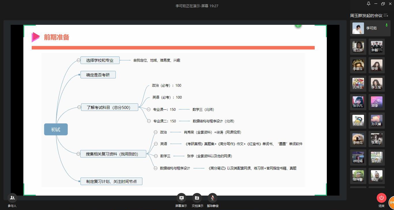 会议伊始,10位同学在各自会场依次分享了自己的考研故事和奋斗历程,每一段故事里都充满了对更高目标追求的渴望,每一段历程中都少不了拼搏坚持的汗水。