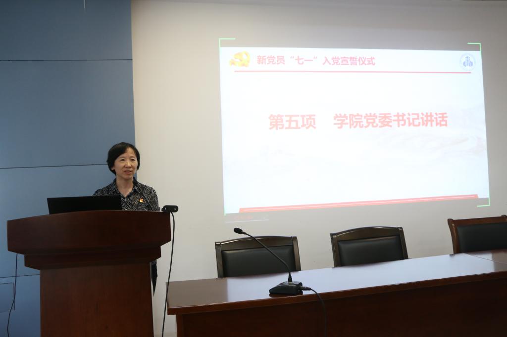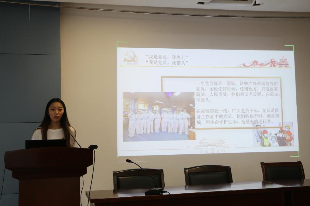 首先,会场奏响《国际歌》,全体参会人起立,齐唱歌曲。接着,学院院党委副书记、副院长吴宝锁带领全体预备党员宣誓,大家庄严肃立,举起右手,面对党旗郑重起誓,声音洪亮。而后,预备党员佩戴党员徽章,将对党的崇敬与热爱牢记于心。今年疫情期间,必赢626net入口首页青年党员主动担当,奉献在抗击疫情的第一线。接着,优秀抗疫志愿者代表费诗然、陈金艳陆续分享了自己的抗疫故事,她们深刻体会到党员在抗击疫情中冲锋在前的义无反顾与责任担当。深受感动的同时,更主动参与到自己社区的抗疫志愿活动中,进行测量体温、宣传抗疫知识等工作,践行“从群众中来 到群众中去”,以服务诠释职责。