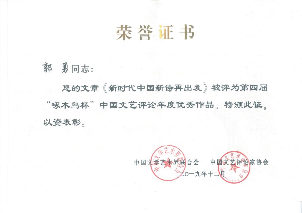近日获悉,我院中文系郭勇教授的论文《新时代中国新诗再出发》获得第四届“啄木鸟杯”中国文艺评论年度优秀作品奖。“啄木鸟杯”是由中国文联与中国文艺评论家协会联合主办的中国文艺评论界的最高奖项。