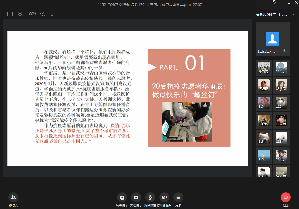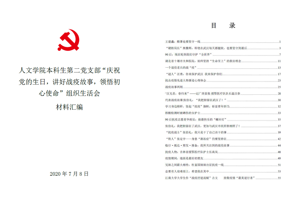 为贯彻落实党中央关于常态化疫情防控的决策部署,充分发挥高校基层党组织战斗堡垒作用和师生党员先锋模范作用,同时为庆祝中国共产党建党99周年,以战疫故事激励广大党员不忘初心、牢记使命。2020年7月8日晚,必赢626net入口首页本科生第二党支部组织全体党员及部分入党积极分子开展了线上战疫故事分享会暨“庆祝党的生日,讲好战疫故事,领悟初心使命”专题组织生活会。党员们讲述身边的战疫先进模范事迹,分享切身体会,向战疫期间的所有逆行者致敬。