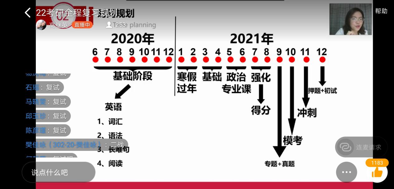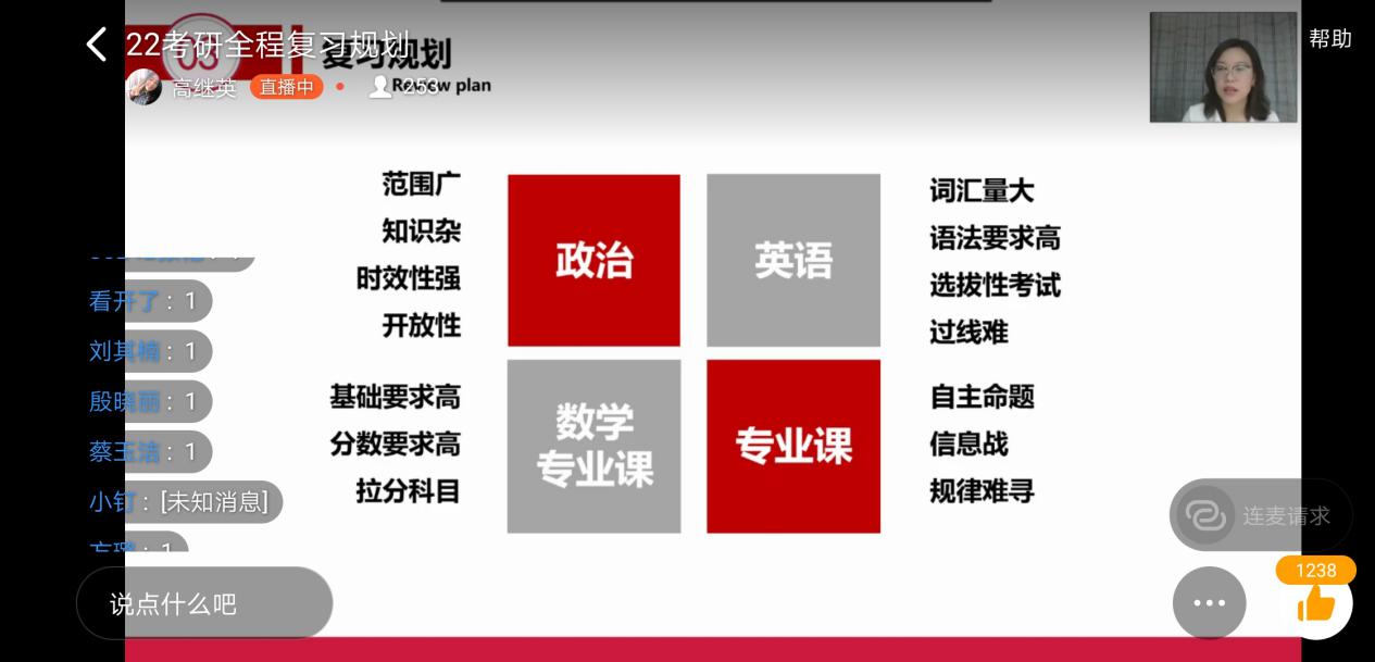 考研直播课内容主要分为四大部分,分别是考研形势、时间规划、复习规划和目标规划。直播伊始,高老师首先为大家分析总结了2020届考研情况,从报考人数到报考类型再到录取结果,各项数据的清晰展示让学生们对于目前的考研局势有了大致的了解。随后,高老师结合2022届学生的实际情况为同学们列出了考研时间轴,并就时间轴中的一些关键阶段做了着重强调,希望同学们能够把握复习节奏,制定合理的复习计划。针对不同学科的复习规划,高老师也给出了自己的意见,不同专业所对应的考试科目各有不同,同学们一定要结合学科特色,政治以范围广、知识杂、时效性强、开放性著称;外语作为选拔性考试,过线较难,在词汇量和语法方面要求高;数学专业课是考研中的拉分科目,基础要求和分数要求高;其他专业课因自主命题而造成规律难寻,不可否认是一场信息战。