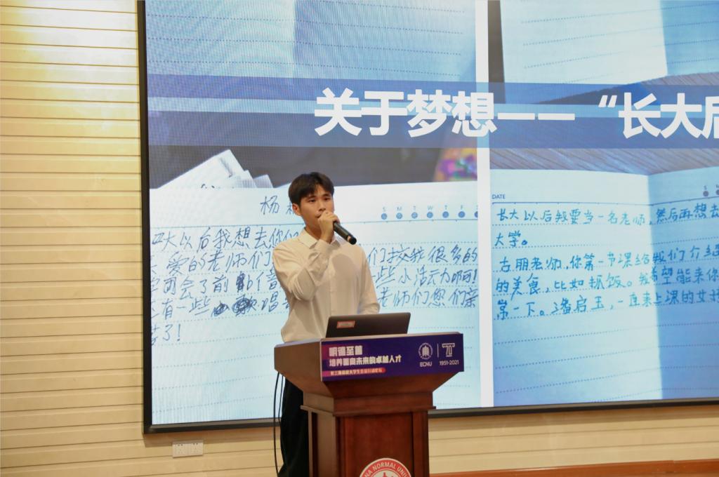 本次论坛在上海市教委德育处副处长杨长亮、华东师范大学党委副书记杨昌利、大夏书院院长沐涛的讲话中拉开序幕。来自长三角地区的5所高校——上海交通大学医学院、同济大学、南京大学、华东师范大学和江南大学的学生代表带来公益项目主题分享和展示,其中,朱程辉代表学院心手相牵社会实践团就《一笔一划致敬建党百年 一字一句矢志教育报国——“心手相牵”推普助力乡村振兴志愿服务》展开分享,讲述了“心手相牵”推普实践团与独洞的故事,从每天起早等待小老师上学的孩子们,到为孩子时刻努力着的父母,希望孩子不要像他们一样,吃了没有文化、说不好普通话的亏。分享尾声,朱程辉表示希望发挥青年人的担当,在为独洞带去更多发展可能的同时,引导孩子们走出大山,去一个更广阔的世界,用普通话这把钥匙,打开山门。