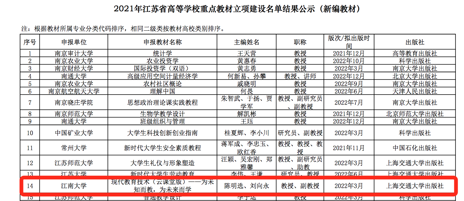 近日,在江苏高等教育网公示的2021年江苏省高等学校重点教材立项建设名单结果(新编教材)中,我系陈明选教授、刘向永副教授主编的教材《现代教育技术(云课堂版)——为未知而教,为未来而学》获批江苏省高等学校重点教材立项。
