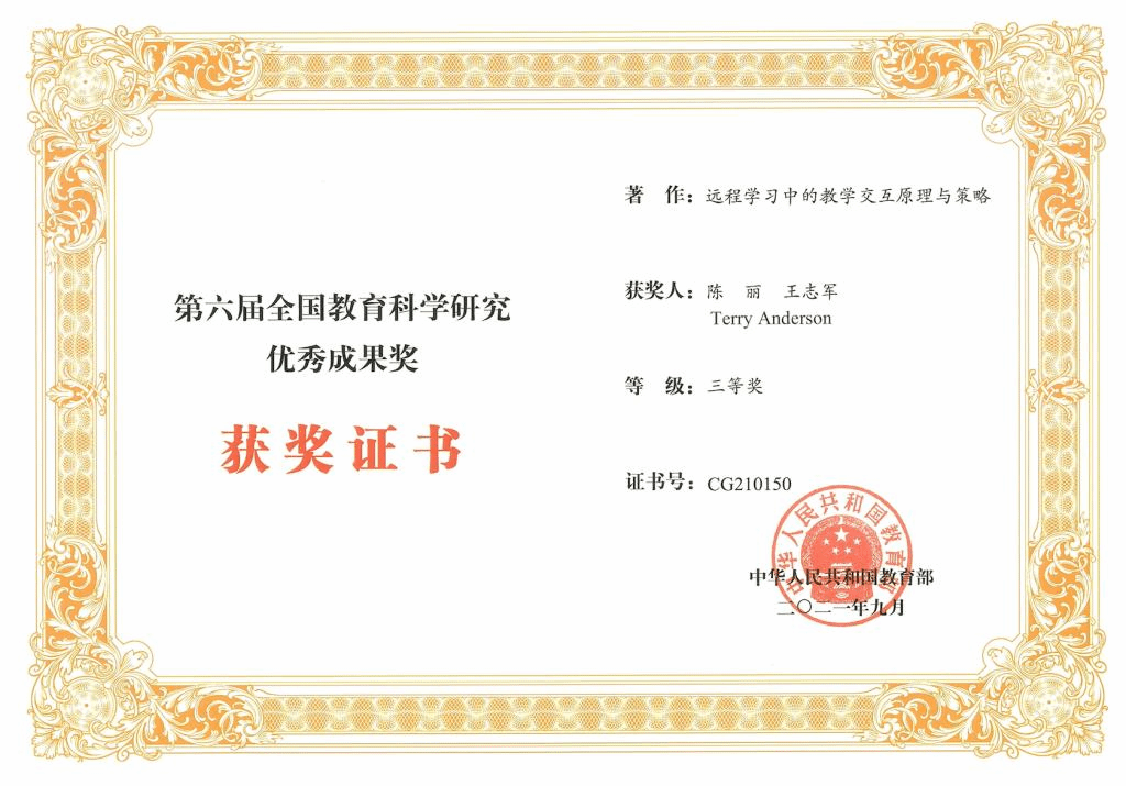 2021年10月15日,教育部公布了第六届全国教育科学优秀成果奖获奖名单, 王志军教授参编的著作《远程学习中的教学交互原理与策略》获得第六届全国教育科学优秀成果三等奖。