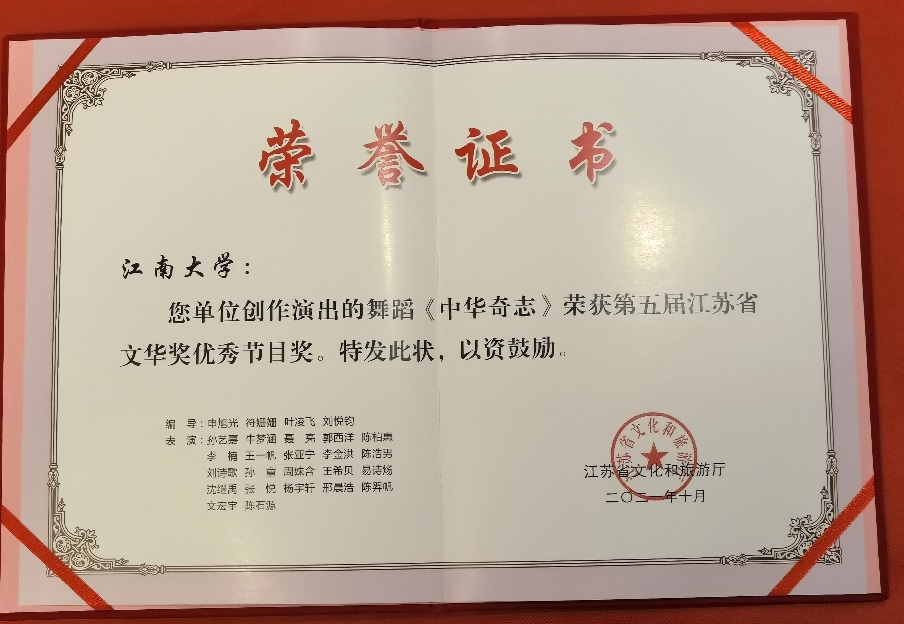 近日,由江苏省文化和旅游厅组织的第五届江苏省文华奖评奖在江苏常州举行。我校必赢626net入口首页舞蹈系申旭光、符姗姗、叶凌飞及刘悦钧四位老师创作的舞蹈作品《中华奇志》,历经半年的不断打磨,最终在全省117个节目中脱颖而出,获得江苏省“文华优秀节目奖”。本次参赛的队伍均来自省内专业院团及艺术院校。该奖项是江苏省人民政府批准设立的省级专业艺术竞赛政府最高奖。