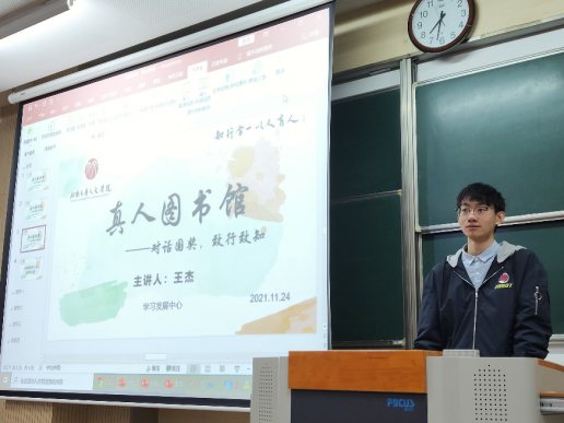 本次真人图书馆依据专业分为小学教育、教育技术、汉语言文学类和艺术类四个分会场举行。小学教育专场,蓝婵妮、孙博茜两位同学从学习方法、心态调整、科研竞赛三个方面进行了分享。蓝婵妮强调了专业学习的重要性,引导同学们要脚踏实地厚积薄发,鼓励同学们勇于参加大创项目和各类科创竞赛。孙博茜则结合个人成长经历,从生活、学习、心态三个方面告诉同学们要热爱生活、热爱学习、热爱工作热爱生命。教育技术专业的沈柯讲述了他从高中和大学初期的迷雾低谷到获得国家奖学金和其他多项奖项荣誉的故事,并建议同学们要在学习上确立目标、放远目光,培养综合能力和扎实的专业素养,积极开拓视野。汉语言文学专场,刘彤彤分享了在学习、实践、思考三方面的经验,她引导同学们夯实基础、拓展研究、了解前沿动态并积极交流。闫格认为中文专业学习要进行大量的知识积累和深度的思考,并结合自身经历鼓励大家敢于试错。王杰则从学业经验、学生实践工作经验和科研经验三个方面分享了自己的经历,他建议同学们重视学习思维的转变、学习习惯的养成、学习态度的端正、考试考察的应对策略和学业技能的提升。艺术专场鲍芊芊和王希贝同学则鼓励同学们以积极向上的心态直面挫折,敢于尝试、勇于创新,定义自己理想的大学生活。