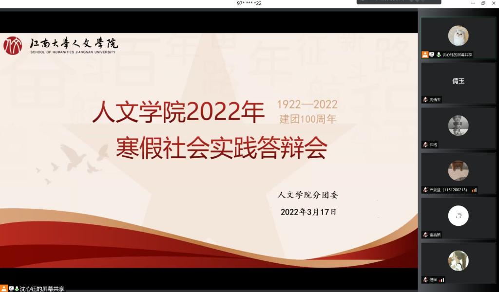 经筛选,此次答辩会共有11支团队、7个团支部和12位同学进入到最终的答辩环节。他们从实践选题、实践过程、实践效果、实践意义等方面介绍了各自团队的实践项目与完成情况。其中,“青春传颂人”团队分享了他们组织动员20余名团员青年参与共读《习近平与大学生朋友们》,同写读后感的实践过程,该项实践成果已陆续在学院公众号上发布。“缓病之计”社会实践团是舞蹈编导2020级同学立足于当代老年人病痛,让舞蹈走进社区伴健康晚年生活做的一次全新的尝试。“心手相牵”实践团这次则通过网络的方式开展了为期7天的“云支教”,为孩子们带去了寒假的问候,同时辅导完成寒假作业,帮助他们完成课业。