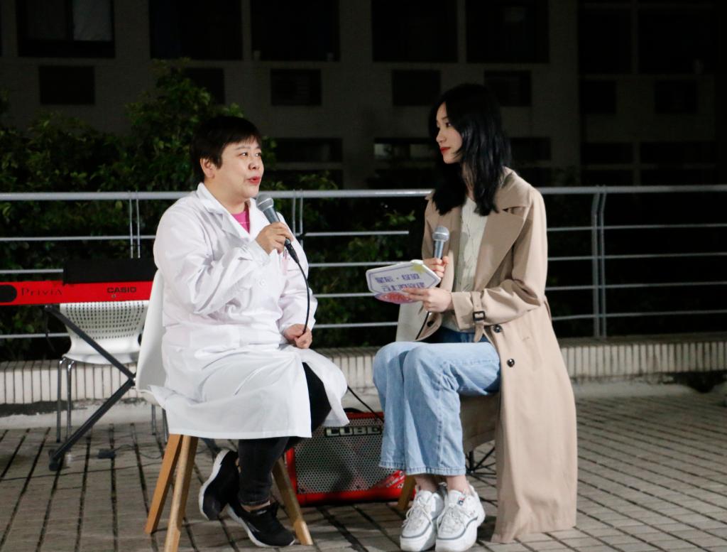 在本次演出致敬医护人员环节中,黄泳骐与徐坤同学共同朗诵了小教2003班刘晓媛同学为此次音乐会特地创作的诗歌《想什么》,向那些坚守在抗击疫情一线的医护人员献上最真挚的感谢与敬意。学生代表将汉师2001班李明洋同学精心创作的医护人员抗疫工作场景漫画作品和鲜花,献给在场的校医护人员代表,感谢他们的坚守与奉献。本次音乐会也邀请到了校医院院长、后勤保障系统党委书记叶军与我们分享疫情防控工作中的主要工作内容与感人故事。通过倾听校医院叶军的讲述,同学们深深地感受到了疫情防控工作的严峻与医护人员的艰辛。随后,同学们和医护人员共同演唱了《明天会更好》,将对未来的美好祝愿寄托于歌声。