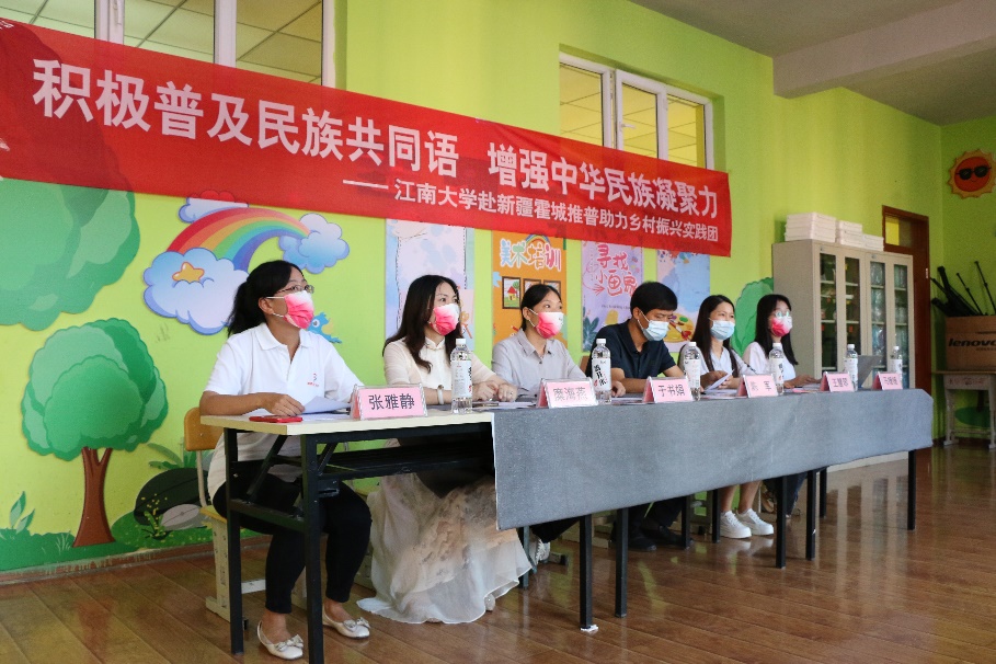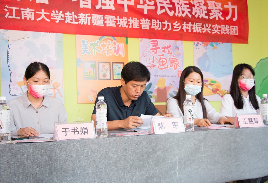 活动伊始,新疆伊犁州霍城县教育局党委委员、局长陈军致辞。他向实践团的到来表示感谢,并指出此次活动充分体现了江南大学深入贯彻落实习近平总书记关于教育的重要论述和关于语言文字工作的重要指示批示精神,期待实践团志愿服务乡村推普工作为铸牢中华民族共同体意识,助力霍城乡村振兴,提升偏远地区青少年普通话水平贡献力量。