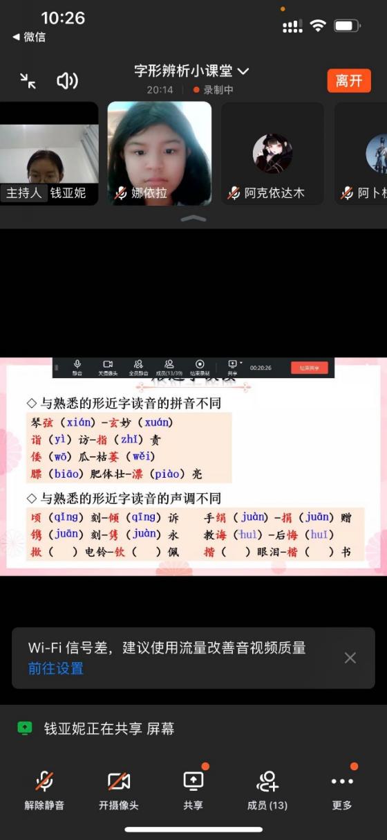 针对孩子们部分音标发音失准、字形书写不规范的情况,团队成员开设了拼音字形游戏课堂,生动地向学生讲解汉字的演变过程及声母、韵母的发音方法,引导孩子们开阔思维并对较难字进行理解分析,营造说普通话用规范字氛围。此外,在字形辨析课上,团队成员细心讲解形近字、同音字、多音字和轻声词各自的内涵以及区分方法,并辅以相关题目实战演练,鼓励学生打开视频当“小老师”。不仅提高了孩子们辨别错字的能力,也提高了他们对汉字的实际运用能力。同时“趣味成语小课堂”的开展极大地增强了师生之间的有效互动。让孩子们在掌握成语使用方法的同时感知语言承载的丰富文化内涵。