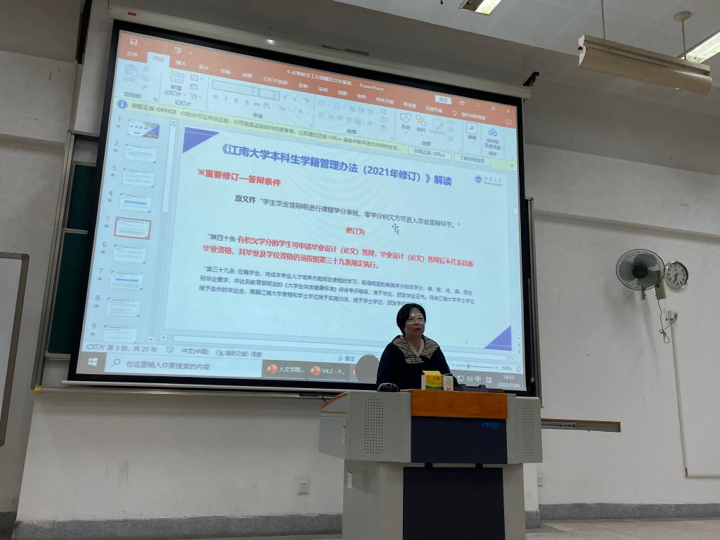 活动伊始,李芳就学籍管理与课程事务进行介绍。李芳首先讲解了《江南大学本科生学籍管理办法(2021年修订)》,着重解释了学籍管理办法中新修订的部分,强调了新生选课、选专业方向过程中的注意事项等。李芳表示修满学分是四年学习生涯中最基础的要求,同学们要时刻关注自己的学籍注册以及选课情况,以在规定时间内顺利达到毕业条件。