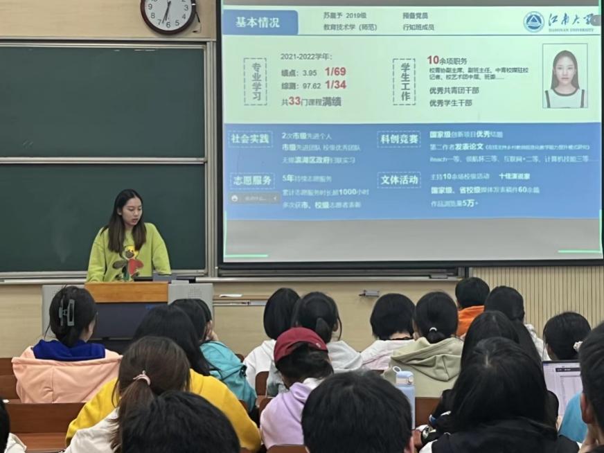 本期真人图书馆根据专业分为小学教育(师范)、教育技术学(师范)、中文类和艺术类专业四个分会场举行。小教专场,施珂玮、张心怡两位同学从笃学、求知、实践、奉献等方面对大学生涯进行规划和引导,以目标、尝试、时间、表达四个关键词鼓励同学们全面发展,做更好的自己。教技专场,陈佳妮结合亲身经历,以“为者常成,行者常至”激励新生坚定、努力地走好自己的大学路,苏晨予则在专业学习、团队合作、时间管理方面作了经验分享,帮助新生找到学习、工作、生活的平衡点。中文类专场,程筱晏怀揣着满腔“少年气”鼓励同学们多读、多写,并积极投入志愿服务和学生事务中去,做一个清醒明亮的中文人;石浩向同学们分享了中文专业必备的网站资源,建议同学们利用好线上资源不断充实自己,于自己心之所向的领域深深扎根;吴芷婧则就课程学习、竞赛科研、大学生活、志愿服务等方面进行了细致的分析和引导。艺术类专场,秦妤菲分享了自己在思想政治、学习科研、生活实践等方面的经验与思考;张亚宁在尝试与止损、规划与安排方面做出了个性化的分享。