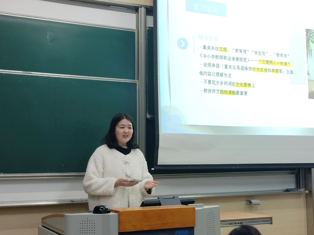 本次会议依次由苏晨予、于雅泉、杨梦萱、陈潘琪、项楚雁五位同学进行经验分享。她们详细介绍了教资考试的构成和具体内容,并分享了许多有关备考的有效建议和实用技巧。苏晨予同学通过现场真题讲解的形势分析了不同题型的答题思路,并梳理了各题型的分值分布比重,帮助同学们厘清备考重点。于雅泉同学从报考注意事项入手,梳理了报考的基本流程,强调要在成绩有效期内合理规划三场考试的时间,实现循序渐进、平和应考。杨梦萱同学基于小学教师资格证中语文和数学两个学科的异同,给出了各自的备考建议,并强调科目一的“文化素养”模块难度大、范围广、知识新,建议大家高效复习、有的放矢。陈潘琪同学结合个人学习经验,强调同学们要利用师范类专业自身具备教育基础知识的优势,还分享了她总结的“口诀+一二级要点框图+网课视频”的联动复习模式,帮助同学们消解备考倦怠与枯燥,强化逻辑和理解记忆。项楚雁同学则着重讲解了作文模块的参考写法和评分体系,并为大家提供了优秀的范文和做题模板。