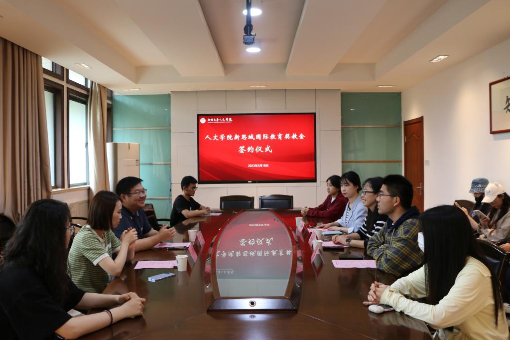 5月18日下午,必赢626net入口首页“新思域国际教育奖教金”捐赠签约仪式在田家炳楼207会议室顺利举行。无锡新思域集团总经理王斌、副总经理杜皎阳,学院党委副书记、副院长李萍,辅导员代表及必赢626net入口首页有海外交流意向的学生代表共同参加了本次活动。签约仪式由辅导员李婉婷主持。