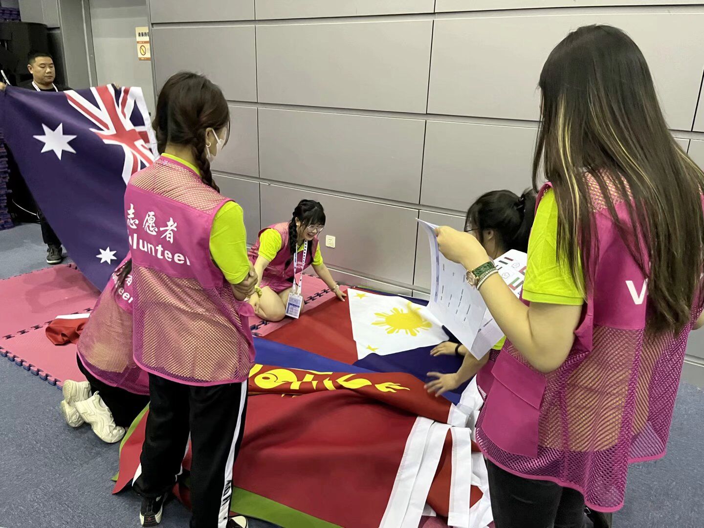 赛事开始前,志愿者们已经进行了亚洲击剑锦标赛的基本情况、颁奖流程、志愿者服务礼仪规范、志愿者安全自护教育等内容的专业培训。赛事期间,志愿者们分散在不同服务点,报道处志愿者协助酒店报到处负责人,帮助办理运动员入住以及物品分发;颁奖协助志愿者负责证书奖牌奖杯的分配,以及国旗的确认;剑道志愿者进行赛场录像回放,帮助裁判员计时记分……比赛现场,人文学子充分展现出我院青年志愿者的青春风采,助力赛事有序进行。