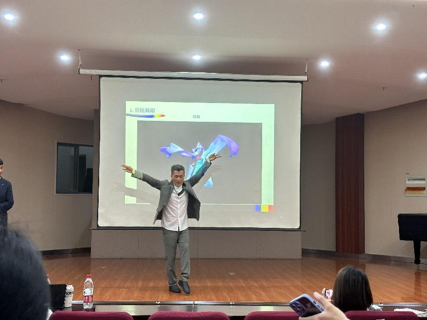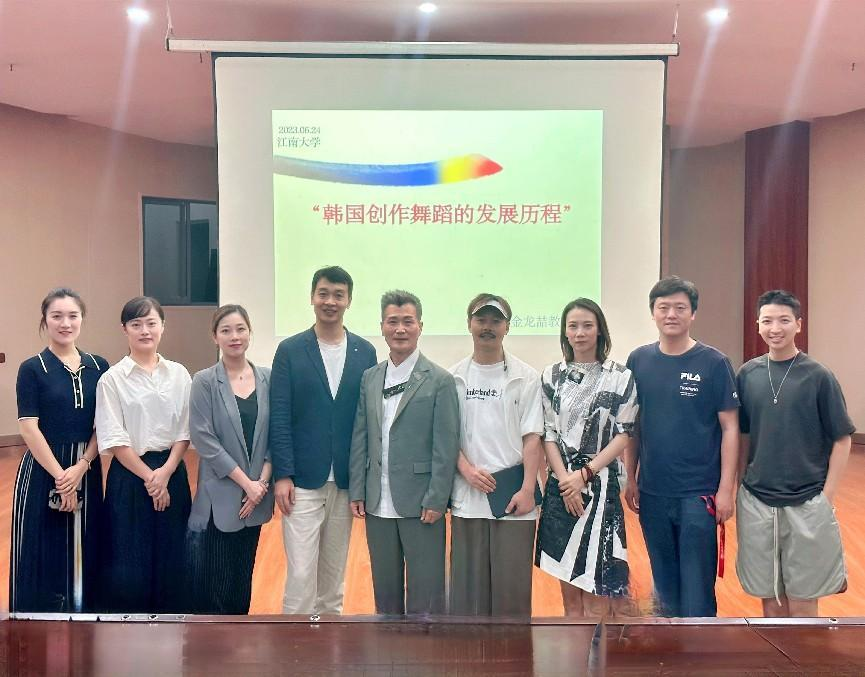 6月25日上午,金教授为我院师生进行了题为:“韩国创作舞蹈的发展历程——以金龙喆舞剧《夜镜台》为例”的讲座。讲座中,金龙喆教授分别从传统舞蹈、新舞蹈、创作舞蹈和个人研究,四个方面向师生们展示了韩国创作舞蹈的发展历程。此外,金教授通过现场表演韩国不同舞蹈形式的舞段,使在场师生对韩国传统舞蹈、新舞蹈和创作舞蹈各自的舞蹈特色一目了然,从而能够清晰地区别三种舞蹈在表演上的异同。金教授优美、细腻的表演也征服了在场师生,他精湛的舞艺令人惊叹。最后,金教授以自己创作的舞剧《夜镜台》为例,对如何将韩国传统舞蹈中的元素运用于创作舞蹈中进行分析。金教授是韩国创作舞蹈的第三代编导中的代表人物之一,在1992年成立了自己的舞团(金龙喆舞蹈团),致力于韩国舞路的创作化,艺术化和大众化,探寻亚洲文化与韩国民族精神的融合。他的舞剧《夜镜台》刻画了韩国现代人们的生活和形象,对生命轮回进行了超越“未来”的传统意义的再闸释。