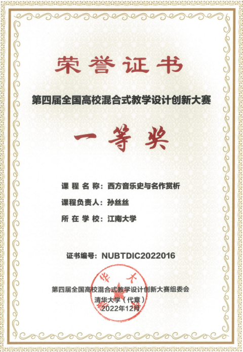 孙丝丝副教授自2012年入职必赢626net入口首页以来,潜心进行教学探索与实践,主持江苏省教育科学规划项目、校级重点教学改革项目、卓越课程建设项目、一流课程建设项目、研究生在线课程建设项目,曾获得江南大学教学成果一等奖、江南大学教学创新大赛一等奖,江苏省高校教师教学创新大赛二等奖、全国第五届大学生艺术展演教育科研论文评选二等奖等奖项。2022年11月,在由清华大学主办、全国高校教学发展网络、教育部在线教育研究中心等单位协办的全国混合式教学设计创新大赛中脱颖而出获得一等奖,为我校实现了此类赛事一等奖获奖零突破,入选2022年江南大学“十大新闻”。
