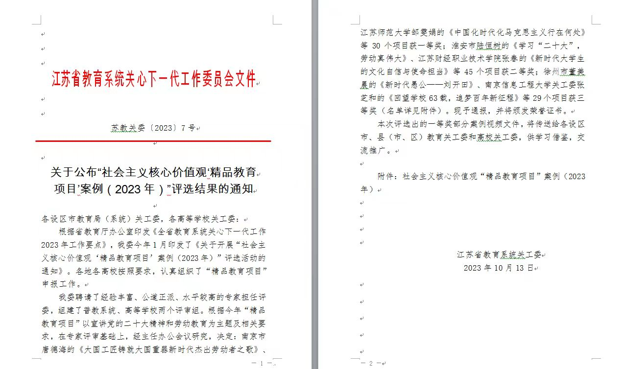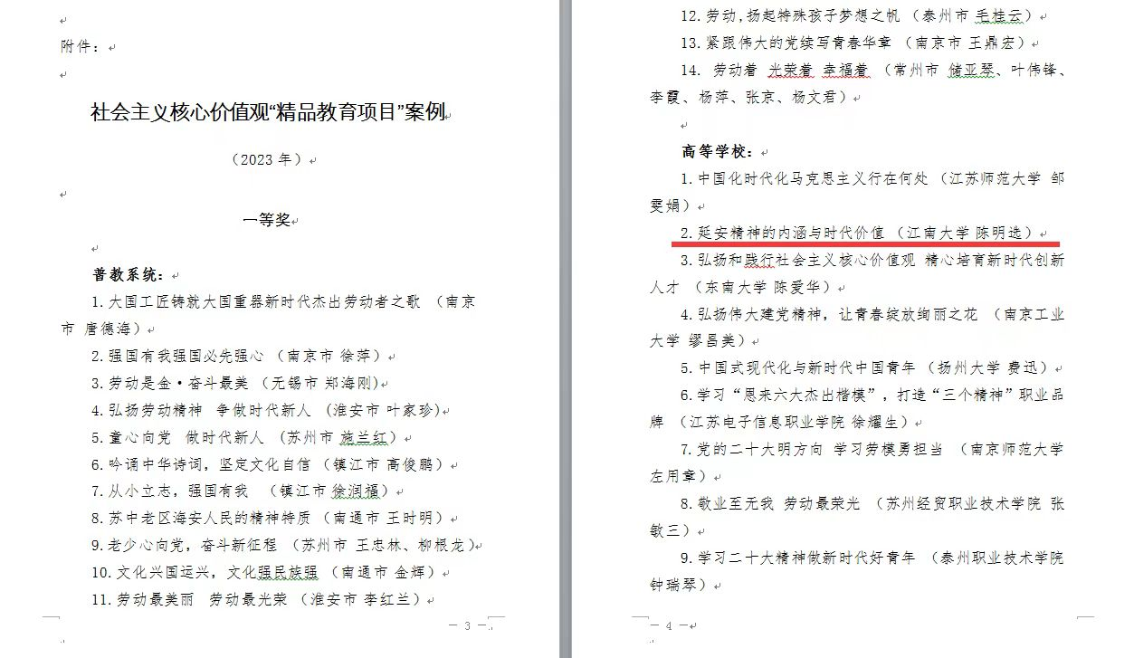 近日,由江苏省教育系统关工委组织开展的“社会主义核心价值观‘精品教育项目’案例(2023年)”评选活动落下帷幕。本次比赛共有来自普教系统和高等学校100多部作品参赛,必赢626net入口首页陈明选教授讲授的《延安精神的内涵与时代价值》荣获一等奖。