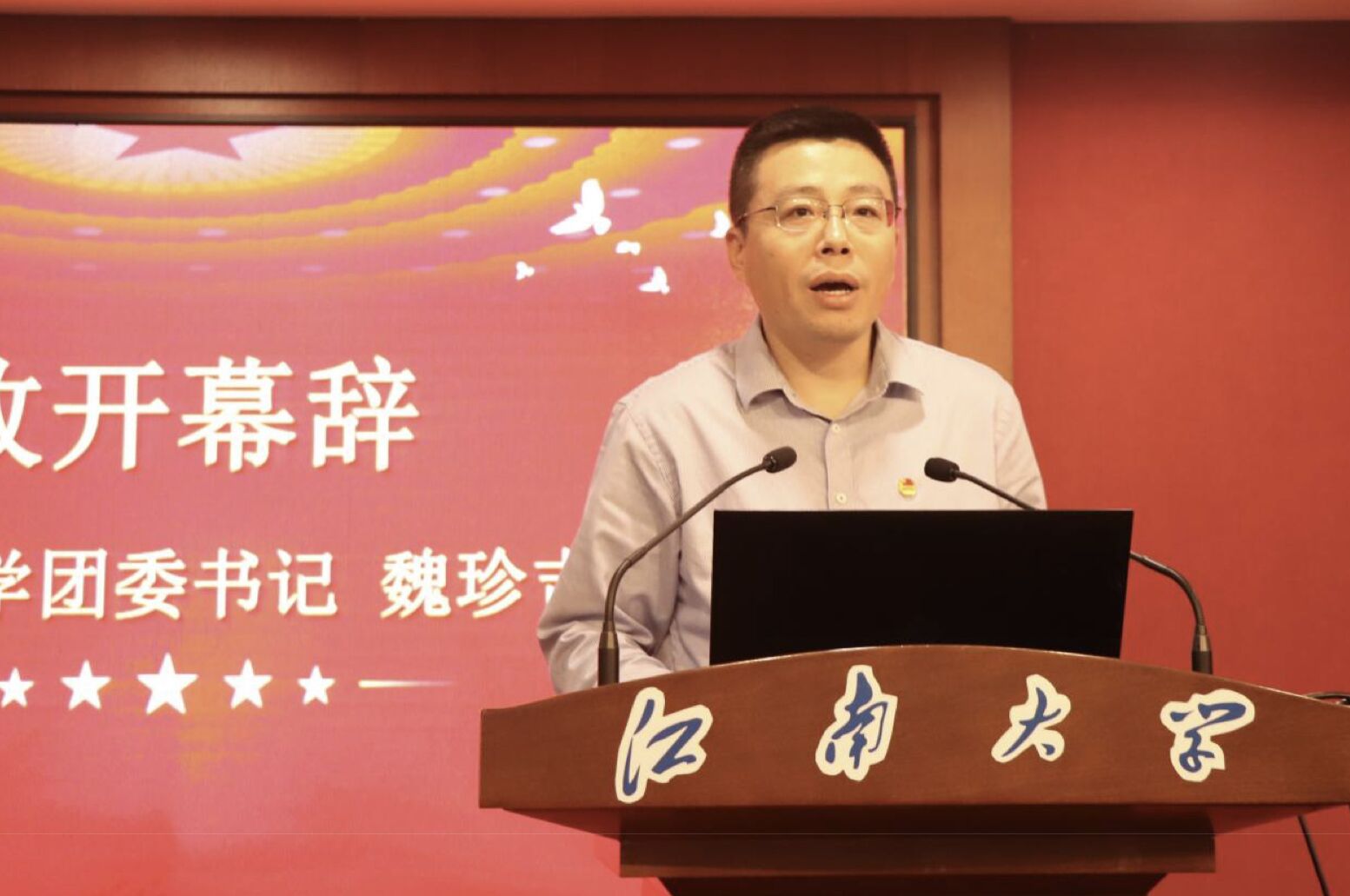 在庄严雄壮的国歌声中,大会正式开幕。魏珍吉致大会开幕辞,代表学校团委,向大会的召开表示热烈祝贺。他高度评价了人文院团学组织在学院的建设和发展上的青春贡献,他指出,我校正处于“奋发有为,跨越发展”阶段的开拓期、“奋进计划”的启动期,全体江南人必须踔厉奋进,为实现学校跻身世界一流大学建设行列的中长期愿景而不懈努力。他代表校团委向必赢626net入口首页团学组织以及广大学生提出三点希望:一是强化思想政治引领,坚定青年理想信念;二是优化立德树人平台,服务青年成长成才;三是深化团学组织改革,凝聚青年智慧力量。