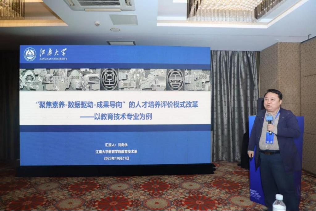 刘向永副教授作了“聚焦素养·数据驱动·成果导向的人才培养评价改革研究”分会场报告,该报告针对当前本科人才培养评价中对学习者的个性化发展支持不足等问题,围绕专业的核心素养和人才培养目标,开展了数据驱动-成果导向的教育技术学一流人才培养评价体系建构与模式变革行动研究。