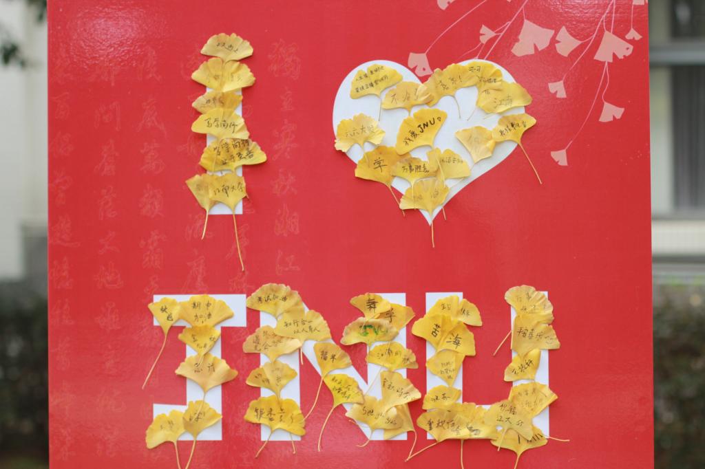 满地翻黄银杏叶,满园银杏落秋风。银杏大道上,大人孩子们拾取落叶,制作属于自己的银杏书签,大家一起工笔细描,粗笔皴染,绘山描水,织木画鸟。近日恰逢江南大学建校65周年,师生校友纷纷将对母校的祝福写在银杏叶上,拼成“I❤️JNU”的字样,表达对母校最真挚的情意。