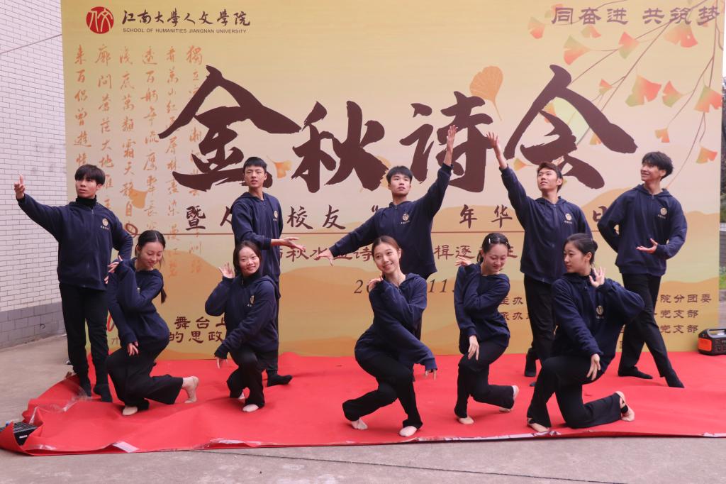 诗会活动分为“逸兴云飞”和“瓦舍小集”两个部分。在“逸兴云飞”部分,舞编专业同学开场呈现的古典群舞《晚秋》用国风描绘山河的壮美,带观众在一呼一吸、一颦一笑间感受中国舞的东方神韵。接着,缘韵笛箫社民乐合奏的《烟雨行舟》,为观众带来一场听觉盛宴,银杏大道声律合鸣,萧声、笛声悠扬婉转,秋日的落叶也随着歌声舞动起来。
