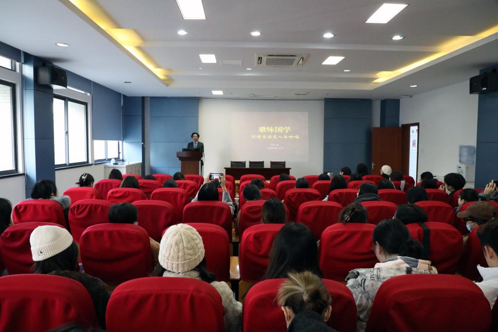 讲座伊始,孙红杰教授从“古诗文入乐吟唱界说”这一话题开始,讲述了“吟唱”的“何谓?何需?何以?”,“吟唱”是汉语古诗文的传统口头演绎方式之一,与朗读、朗诵、吟诵、歌唱、曲唱等其他方式不同,其对诗文之语言性、音乐性和文学性有良好的兼容与平衡,“入乐吟唱”则在吟唱基础上进一步强化音乐性,以便将古诗文演绎为形式考究、内容丰富趣味生动的艺术作品。中国古代的诗词歌赋原本都以吟唱方式传播。诗文中内置着旋律、节拍、节奏、调式、调性等音乐元素。在结构和章法自由的歌行体古诗中,更是不止。