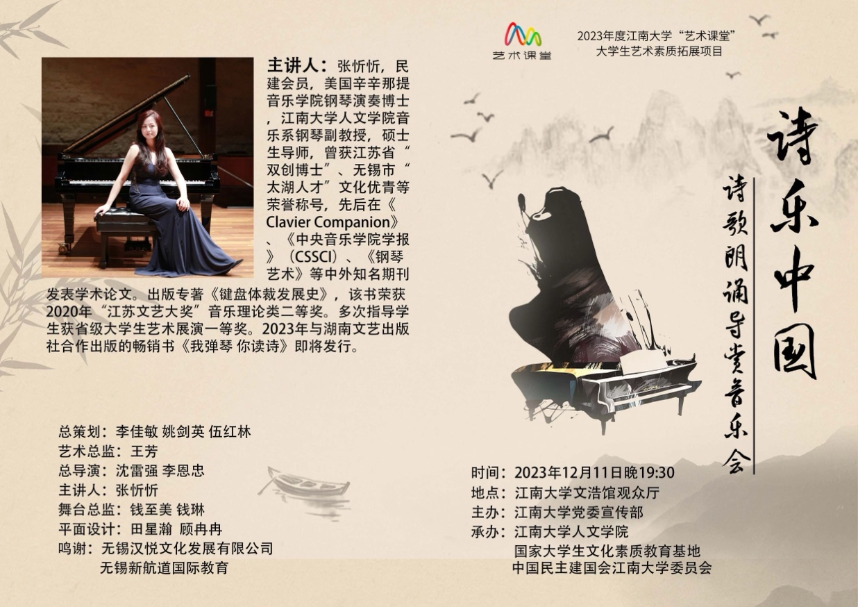 2023年12月12日晚,江南大学“艺术课堂”:诗乐中国——诗歌朗诵导赏音乐会在我校文浩馆举办。江南大学党委常委、统战部部长、工会主席朱飞、江南大学宣传部部长李佳敏、学院党委书记姚剑英、必赢626net入口首页副院长王芳、于书娟、马志强等出席了本次活动。