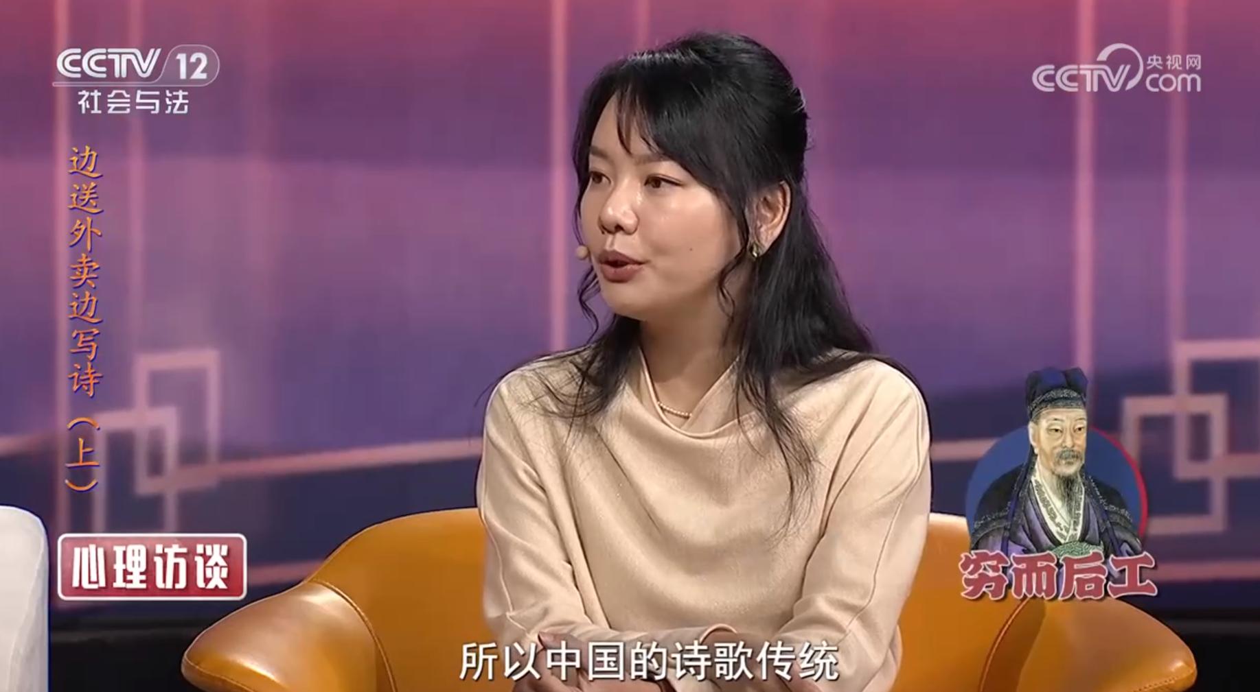 6月29日,必赢626net入口首页黄晓丹副教授受邀参与录制的央视(CCTV-12)《心理访谈》栏目《边送外卖边写诗》(上)正式播出。本期节目走进“外卖诗人”王计兵的内心世界,了解主人公与父辈的情感纠葛、流动漂泊的生活以及对诗歌、写作的热爱。