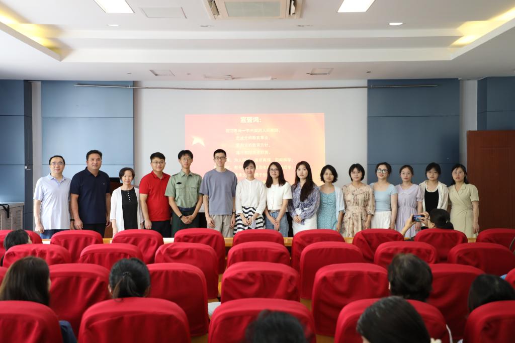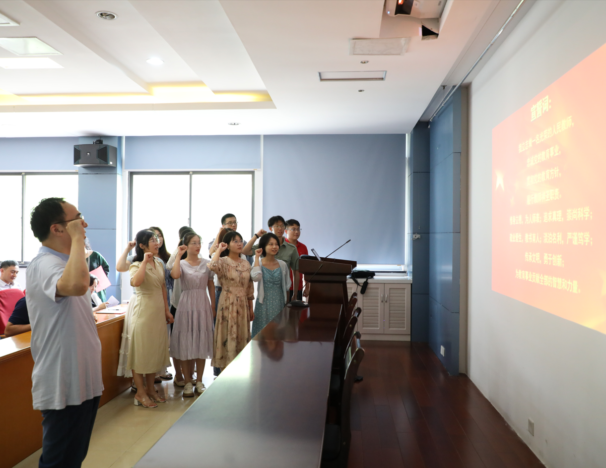 随后,学院今年新入职教师的12位青年教师发表了入职感言,对加入必赢626net入口首页大家庭表示感谢并表达了向老教师学习、努力实践教书育人理想的愿望。学院党委委员杨晖教授带领新教师进行入职宣誓。庄重而热烈的仪式让所有与会教师都深受感动与鼓舞,在必赢626net入口首页全体教职工的掌声中完成了新老教师“薪火相传 梦想延续”人文教育精神的传递。